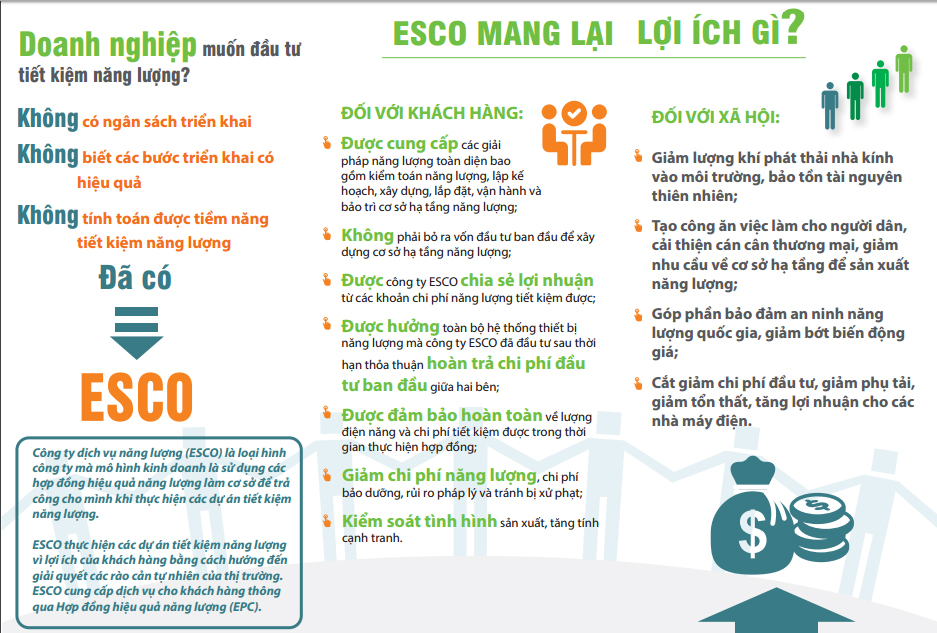 ESCO thực hiện các dự án tiết kiệm năng lượng vì lợi ích của khách hàng bằng cách hướng đến giải quyết các rào cản tự nhiên của thị trường, ESCO cung cấp dịch vụ cho khách hàng thông qua Hợp đồng hiệu quả năng lượng (EPC).
